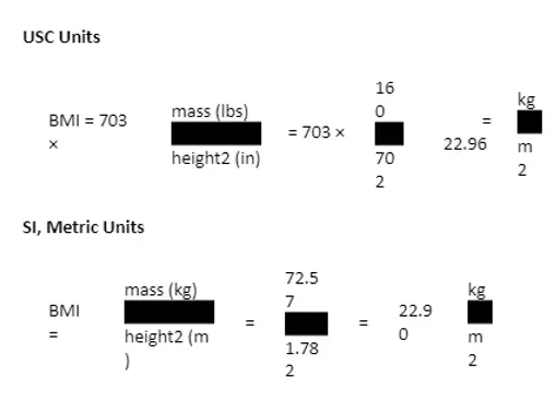The below formulas can be used to calculate the BMI values by considering the mass and the height values in USC AND SI units respectively.