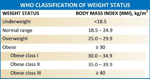 - The below chart curated by the WHO will give an overall analysis of the BMI Values and the corresponding weight status.